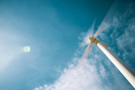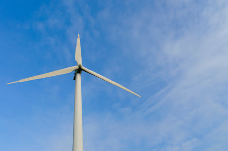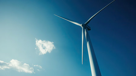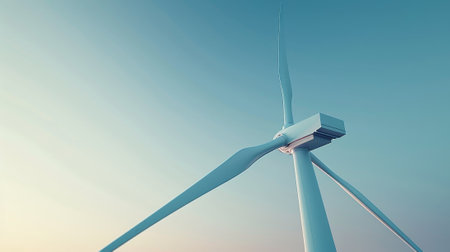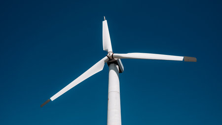 Close-up view of a wind turbine showcasing sustainable energy against a serene blue sky.