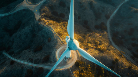 Aerial view of close up windmill turbine in countryside area, Wind power and renewable sustainable energy concept