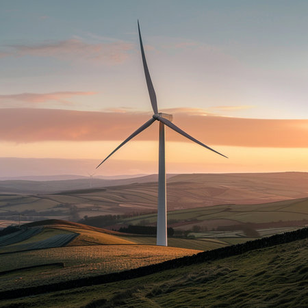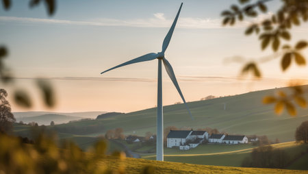 Wind turbine stands tall in rolling hills during sunrise near a quaint village in rural landscape