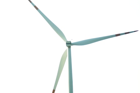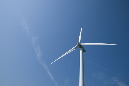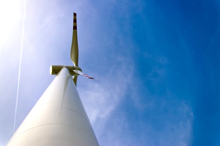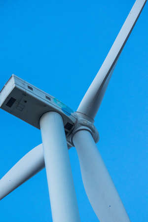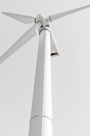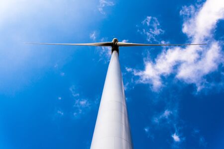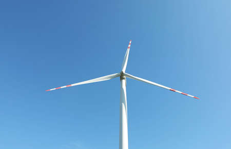 White wind turbine for alternative energy in day with blue sky background, electric clean power concept