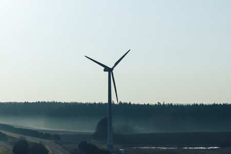 Wind turbine renewable energy source summer in forest mountains landscape energy transmission distribution equipment in natural environment.