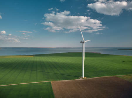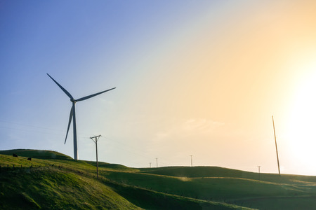 Wind turbine generating electricity clean energy with cloud and sunlight background on the sky. Clean energy concept. High quality photo