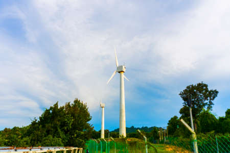 Windmill in a wind farm with blue sky at Khao Kho District Phetchabun Province, Thailand.
