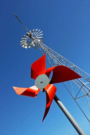Multi-bladed windpump on blue sky background. Text for space