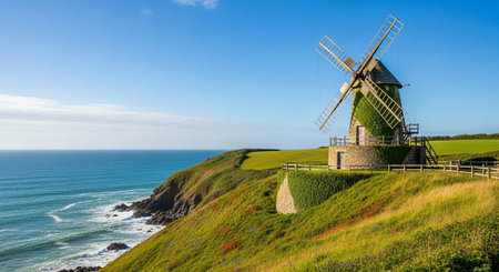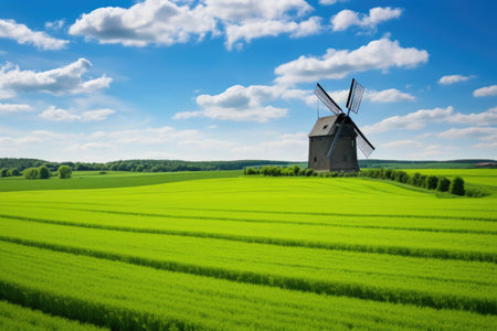 A picturesque windmill stands tall amidst green fields under a bright sunny sky, symbolizing traditional rural life.. AI Generation