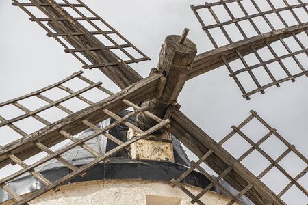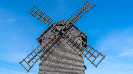 An old wooden windmill. The mills were used for grinding grain, wheat, and other legumes. An object of cultural heritage.