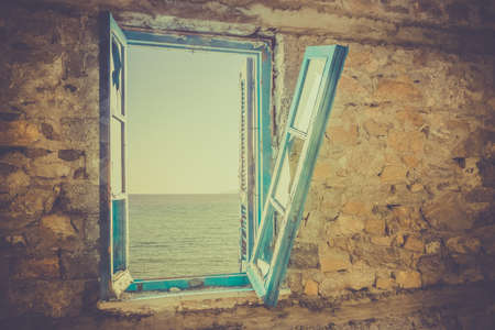 Old wooden window bokeh frame with glass beautifully lit on ruined house wall background. Abandoned building exterior interior architecture design