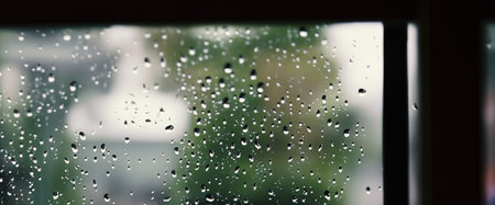 Droplets collect on a window during rain, creating a blurred view of lush greenery outside.