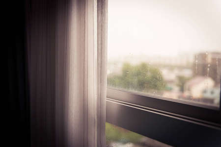 The view from the window. Window in the apartment. Interior details. Window frame in the building.