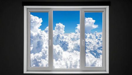 White window with blue sky and white clouds on black wall background.