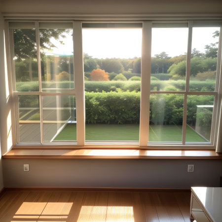 A tranquil view from an elegantly designed room window showcases a vibrant garden filled with colorful flowers and lush greenery, illuminated by soft sunlight.