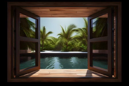 Window view of tropical garden with swimming pool, Generative AI content