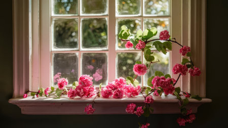 A vibrant arrangement of pink flowers adorns a sunlit windowsill in a charming setting.