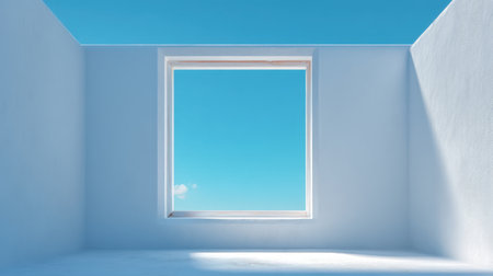 A tranquil interior scene showcasing an empty room with a square window framing a bright blue sky, inviting natural light and a sense of calmness and minimalism.