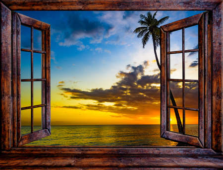 tropical landscape view from an open window to the sea sunset