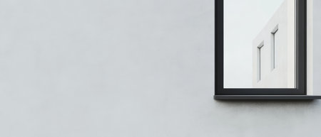 A sleek black frame surrounds a glass reflecting part of a contemporary building. The smooth gray wall enhances the modern aesthetic emphasizing simplicity and elegance.