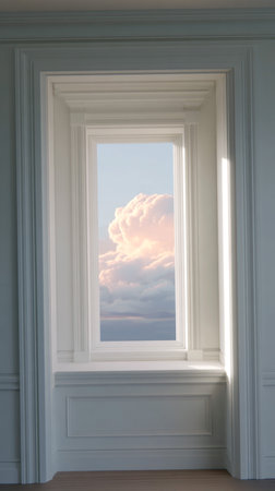 Window frame reveals beautiful pastel clouds in a clear sky, allowing natural light to fill the room, enhancing the peaceful ambiance and inviting calmness