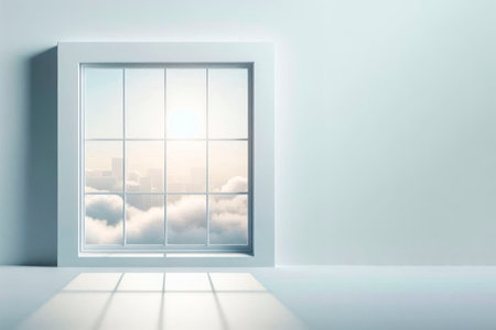 A stunning image of an open window frame allowing soft natural light and a clear blue sky to illuminate the interior, creating a serene atmosphere.