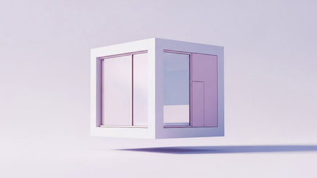 A minimalist 3D rendering of a white cube structure with translucent pink glass panels, floating in a soft, pastel-colored environment.