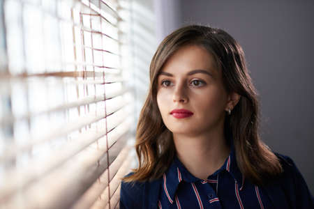 Woman drinking coffee and looking outside through American blinds. Copy space