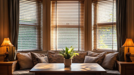 Blinds covering a bay window in a classic home interior with wooden furniture and soft lighting