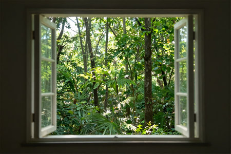 A view through the window of a private house in the jungle.