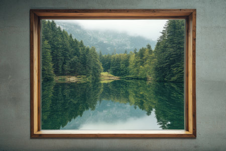Bright morning light illuminates the reflection of a peaceful lakeside landscape framed by a rustic wooden window.