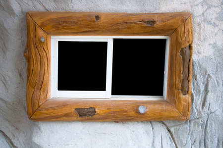 framed wood window on stone wall
