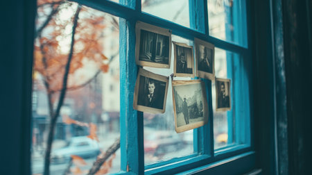 A charming scene showcasing vintage black and white photos suspended on a blue window frame, evoking nostalgia with autumn leaves framing the view.
