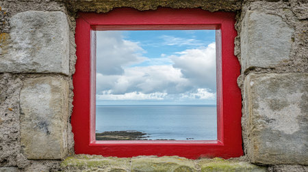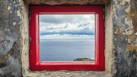 A captivating view of the tranquil ocean and sky captured through a vibrant red-framed window on an ancient stone wall. This image conveys peace.