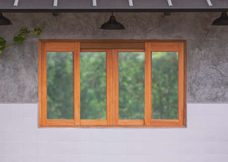 Background of glass and wooden sliding window with hanging lamps on concrete and white tile wall of vintage restaurant