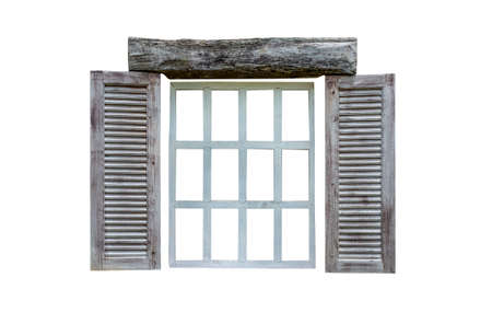 Isolated wooden window frame on white background, twelve panes, old and vintage style wooden window, old by weather condition.