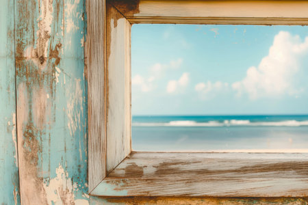 Rustic wooden frame provides a unique window to a calm, tranquil beach, blending vintage charm with coastal tranquility