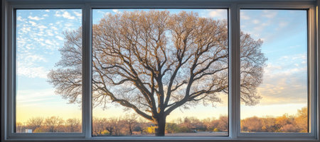 Majestic tree view through a modern window during a colorful sunrise, creating a peaceful and inspiring atmosphere