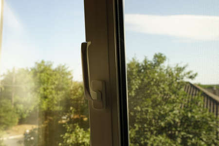 Plastic window and plastic window handles, blurred view from the window