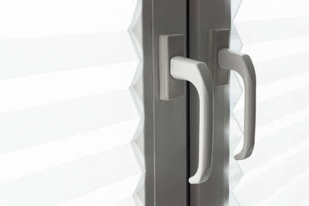 Open steel or plastic glazed door frame and blinds, handle closeup view. Aluminum or PVC window detail.