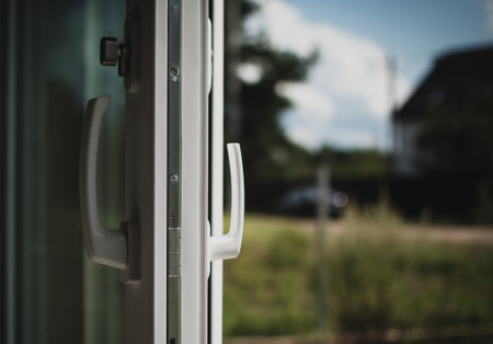 handles of opened white plastic window indoor closeup