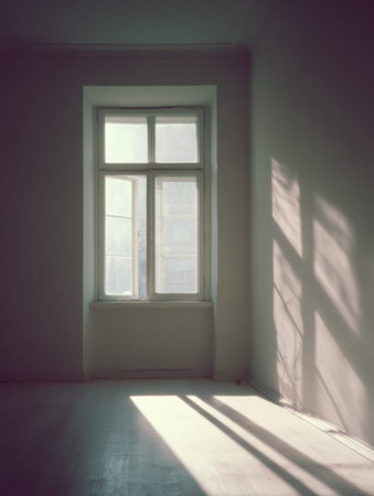 Sunlight streaming through an old window, illuminating floating dust particles in a dark, moody room