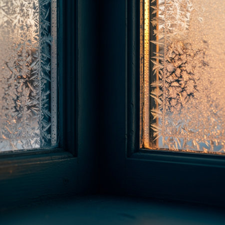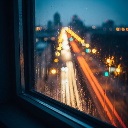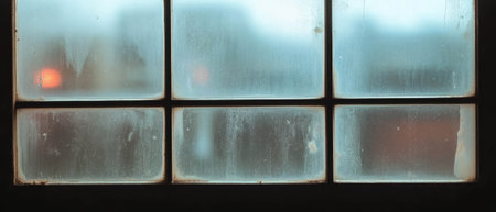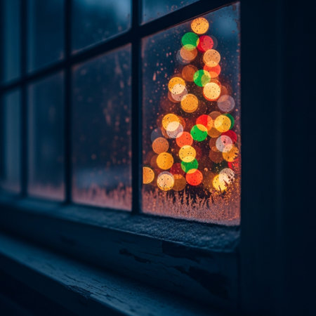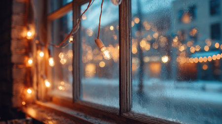 Capture the essence of a cozy winter evening as warm glowing lights twinkle outside a foggy window, creating a tranquil and inviting atmosphere.