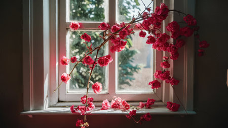 A vibrant branch of red flowers spills over a white windowsill bathed in sunlight, creating a picturesque scene.