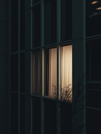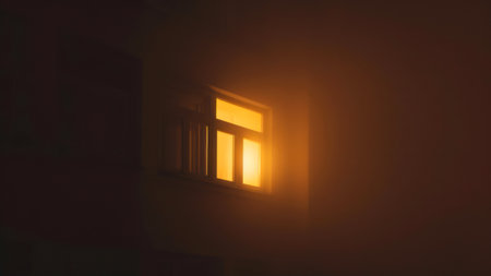 A solitary window illuminates the night with a warm glow, contrasting against the dark exterior, creating an inviting atmosphere in an urban environment.