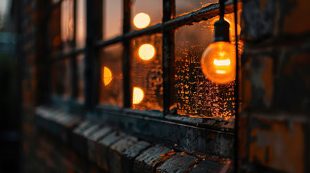 Warm glow from hanging light bulb illuminates rainy window, creating cozy atmosphere. blurred bokeh lights in background enhance inviting ambiance of modern room