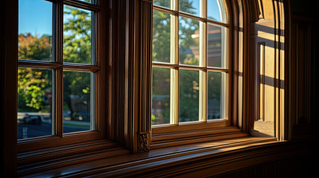 A serene view of elegant wooden windows inviting soft sunlight and shadows into a cozy interior, showcasing natural beauty and architectural detail.