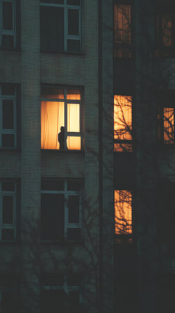 silhouette of person at illuminated window in apartment building, evening solitude concept