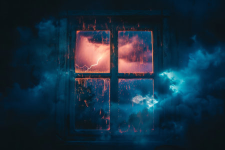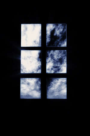 Bright white light outside the window. Spotlight outside the window. Half open window with view to the outside half on gray storm and half on clouds in blue sky with sun