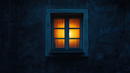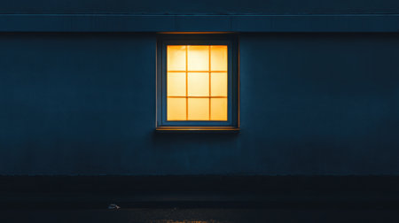 A warm glow emanates from a window set against a dark blue wall, creating a peaceful ambiance. The contrast between light and dark evokes feelings of comfort and solitude.