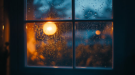Generative AI Image of Gentle Raindrops on Wet Glass Window Illuminated with Soft Orange Lamp