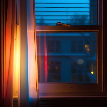 A warm light emanates from a window at night, highlighting soft curtains against a dark wall, creating a cozy and inviting atmosphere that sparks curiosity.