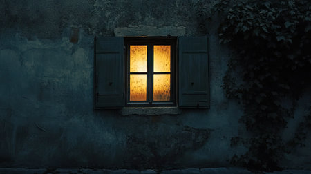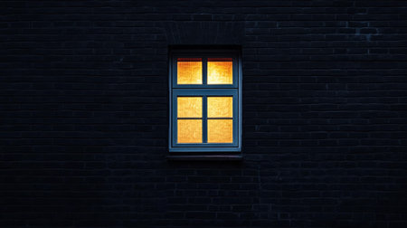 A glowing window in an urban setting stands out against a dark brick wall, creating a serene atmosphere that evokes feelings of warmth and solitude at night.