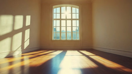 Empty modern room with sunlight streaming through a large window, creating warm shadows on white walls and polished wood floors.
